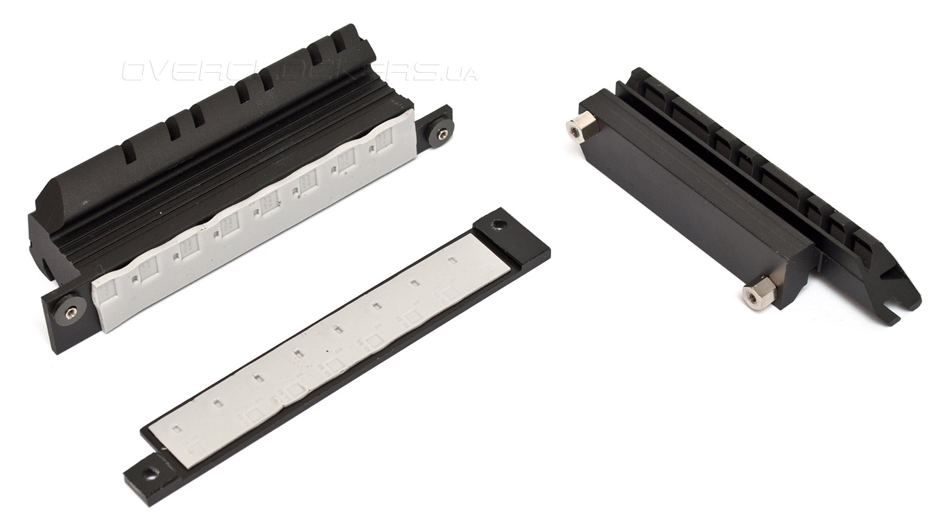 На подошву охладителя VRM нанесена толстая прокладка из мягкого теплопроводящего материала, для крепления используются винты, а массивная металлическая пластина, распложенная с обратной стороны РСВ, предотвращает деформацию текстолита и обеспечивает высокое усилие прижима. Как и следовало ожидать, термоинтерфейс на бутафорском радиаторе отсутствует.