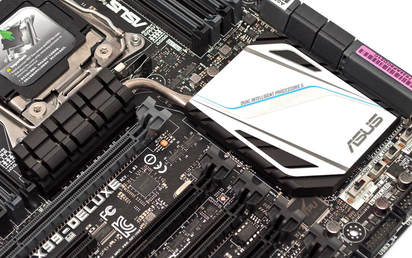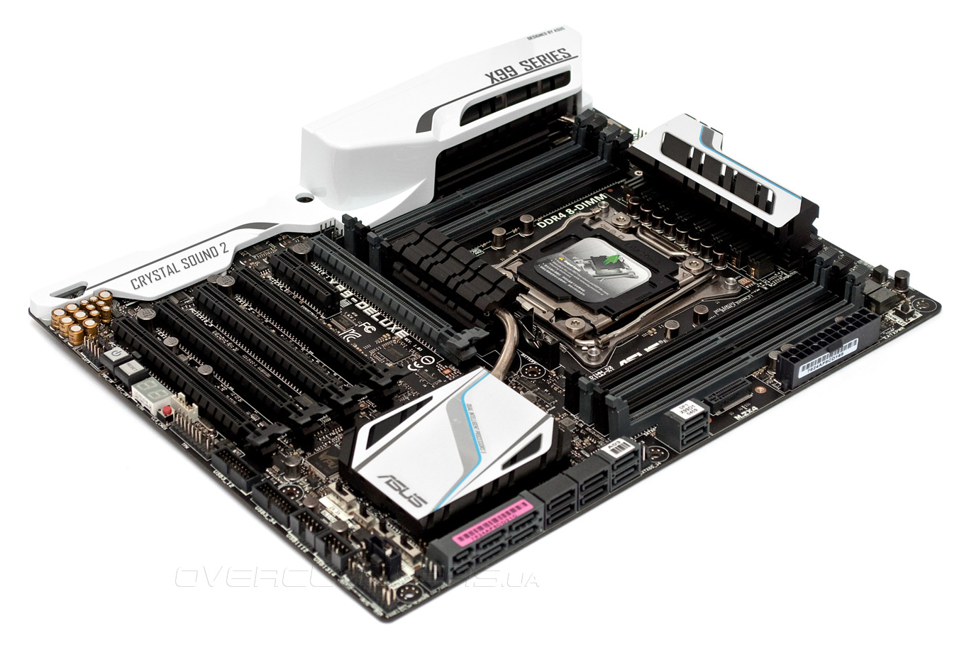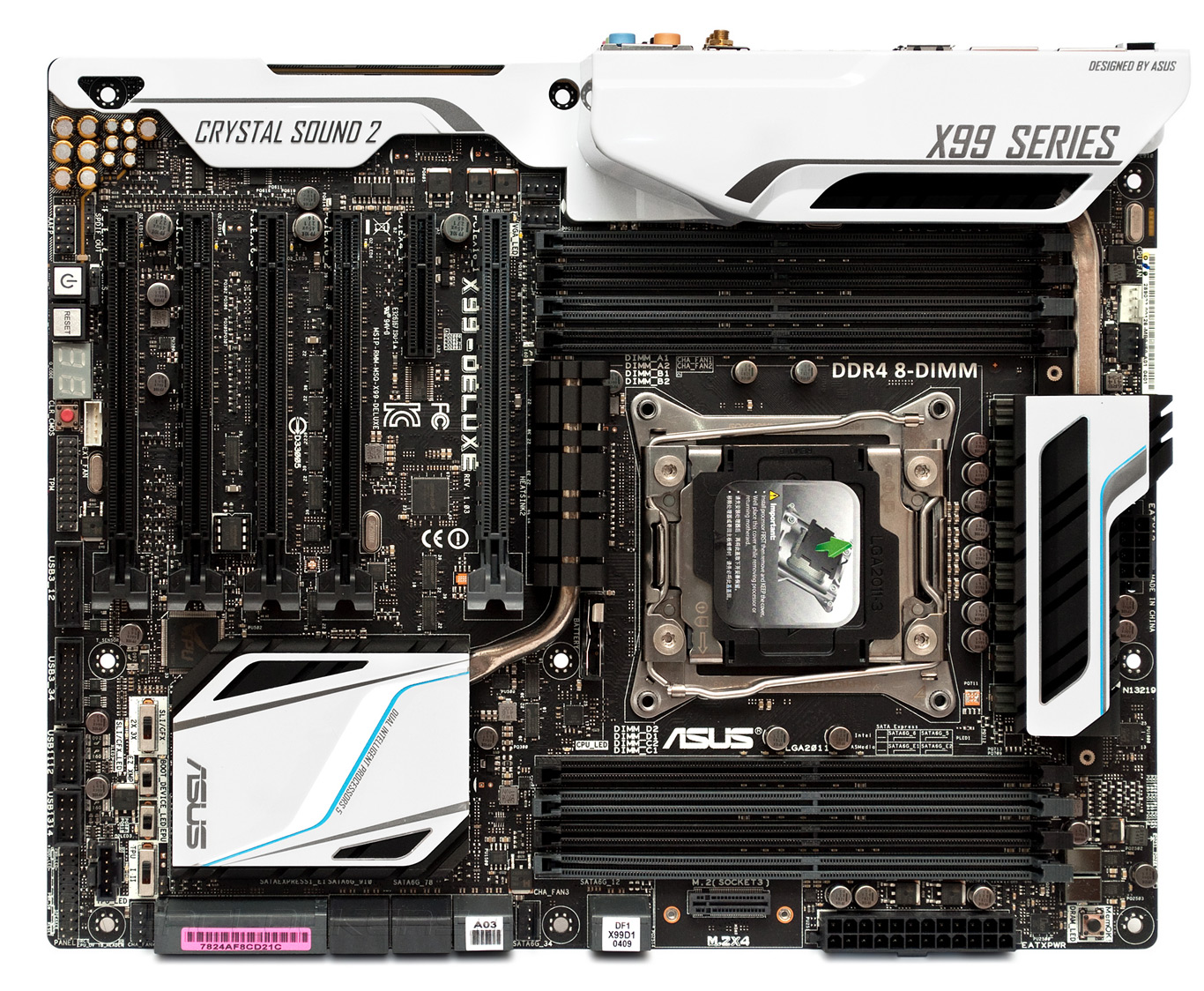 Материнская плата базируется на чипсете Intel X99, ее размеры соответствуют стандарту АТХ. Чрезвычайно плотное расположение компонентов и отсутствие свободного места на текстолите объясняются богатым набором возможностей расширения ASUS X99-Deluxe. Из необычных решений следует отметить белый пластиковый кожух, распложённый по левому краю системной платы, который, впрочем, выполняет лишь эстетическую функцию. Для установки модулей ОЗУ стандарта DDR4 служат восемь слотов DIMM, суммарный объем оперативной память может достигать 64 ГБ. Поддерживается тактовая частота до 3200 МГц в режиме разгона.