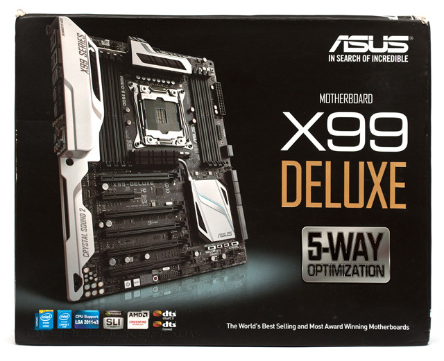 Материнская плата ASUS X99-Deluxe поставляется в крупной картонной коробке, ее дизайн выполнен в стиле, знакомом нам по современным продуктам ASUS. Оформление фронтальной поверхности лаконично, центральное место занимает изображение системной платы и наименование модели.