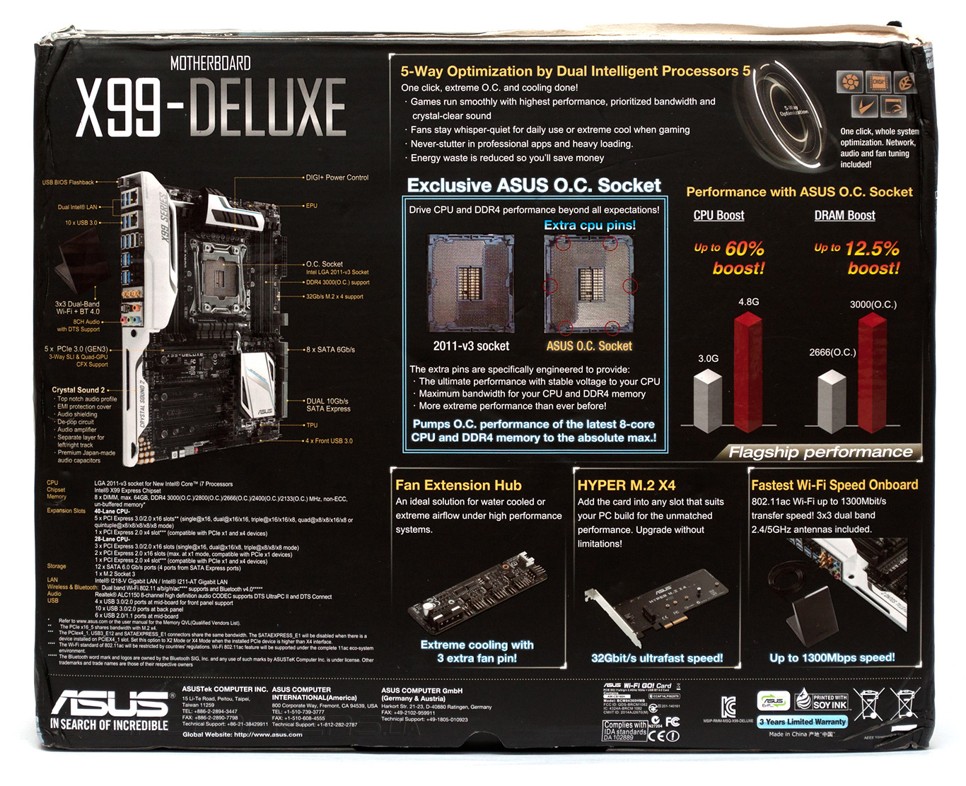 Обратная сторона коробки несет множество полезной информации. Здесь приведено схематическое изображение материнской платы и ее краткая спецификация, а также сведения о ее наиболее важных особенностях, таких как применение специального процессорного разъема ASUS O.C. Socket, наличие в комплекте дополнительных плат Fan Extension Card и Hyper M.2 x4, а также поддержка беспроводной передачи данных по стандарту Wi-Fi со скоростью до 1300 Мбит/с. В основе дизайна системной платы лежит концепция 5-Way Optimization, которая включает оригинальные технологии разгона, экономии электроэнергии, управления скоростью вращения вентиляторов и автоматического повышения быстродействия.