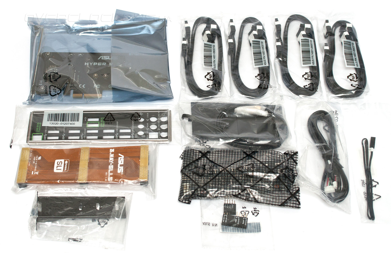 Набор аксессуаров, которым комплектуется ASUS X99-Deluxe, достаточно разнообразный. Он содержит:
