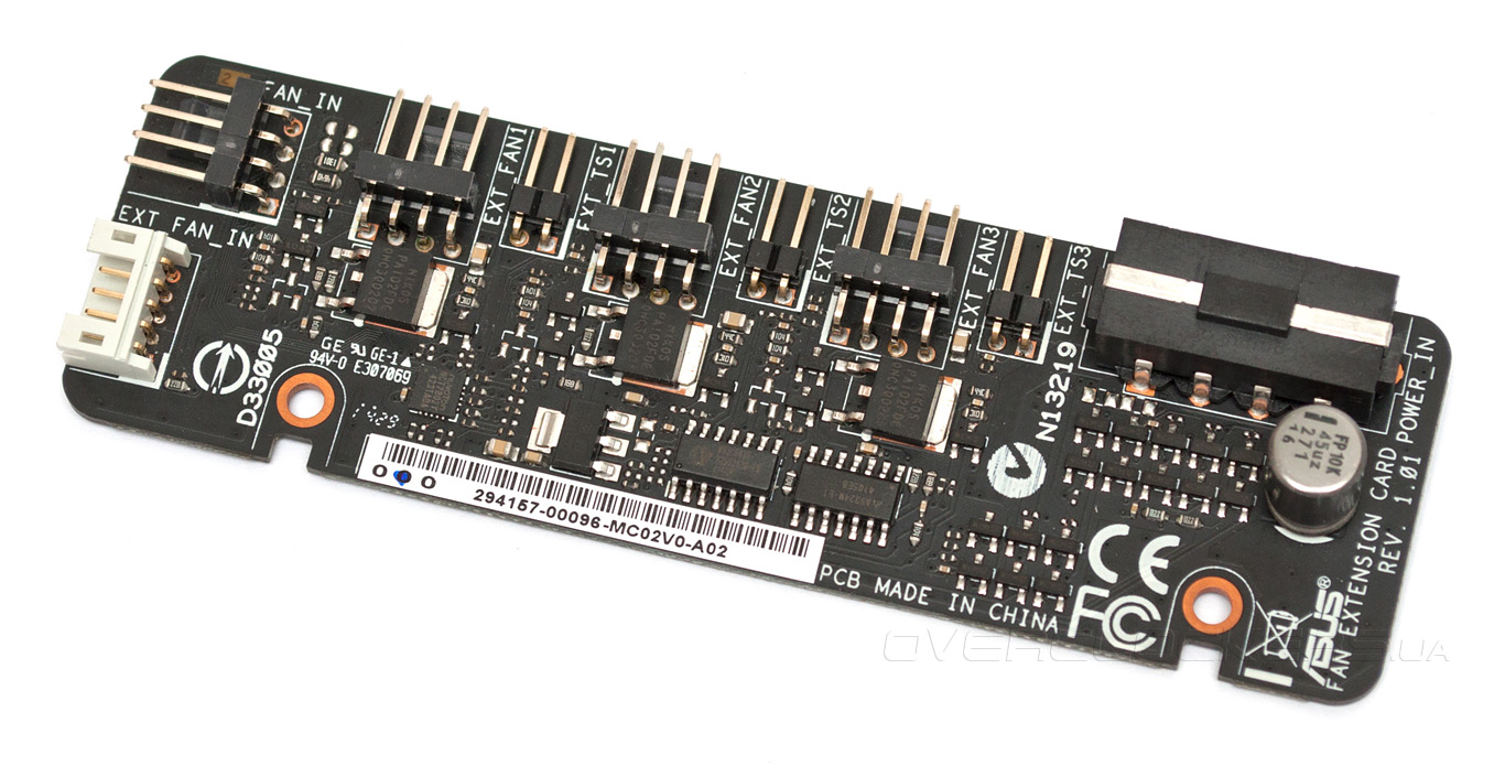 Одним из самых с интересных аксессуаров новинки является плата расширения Fan Extension Card, с помощью которой к ASUS X99-Deluxe можно подключить три дополнительных вентилятора. Внешнее питание подводится посредством стандартного разъема типа «молекс», а для коммуникации с «материнкой» служит комплектный кабель длиной около 20 см. Для каждого из трех каналов предусмотрена регулировка скорости вращения с помощью ШИМ, а также подключение внешних температурных датчиков. Управлять «карлсонами» можно из UEFI Setup или с помощью фирменного ПО ASUS Ai Suite 3.
