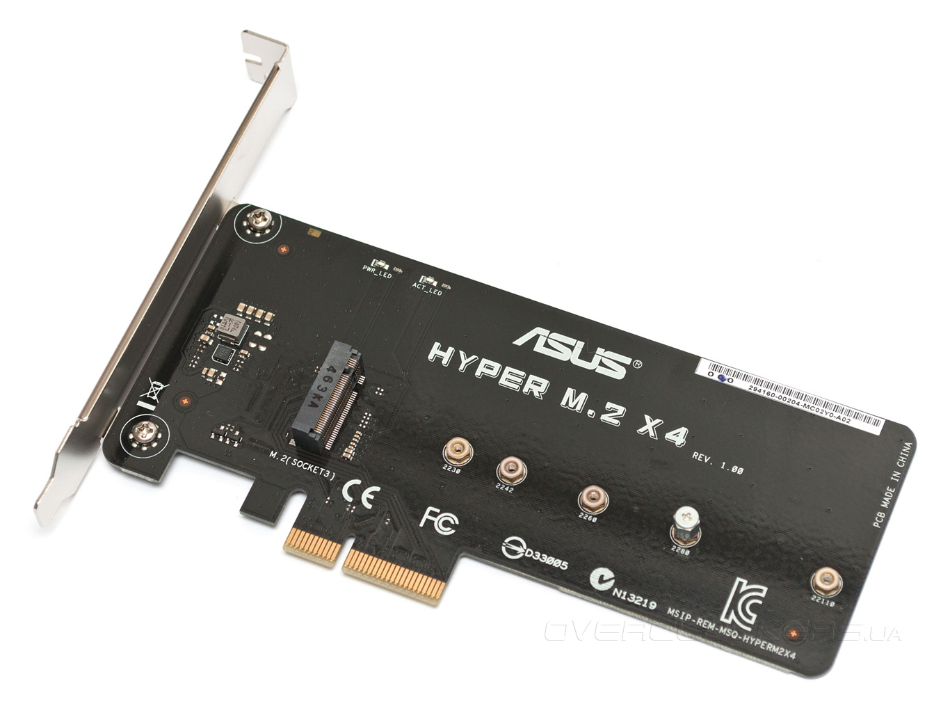 В комплекте с платой поставляется адаптер Hyper M.2 x4, который инсталлируется в свободный слот PCI-E x4 системной платы и предназначается для установки твердотельных накопителей с разъемом М.2, причем, поддерживаются только продукты с интерфейсом PCI Express.