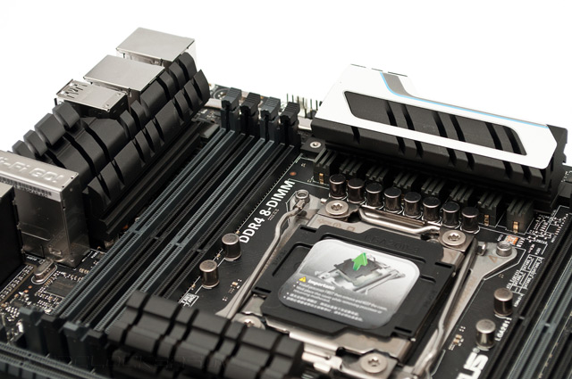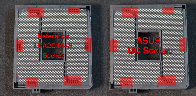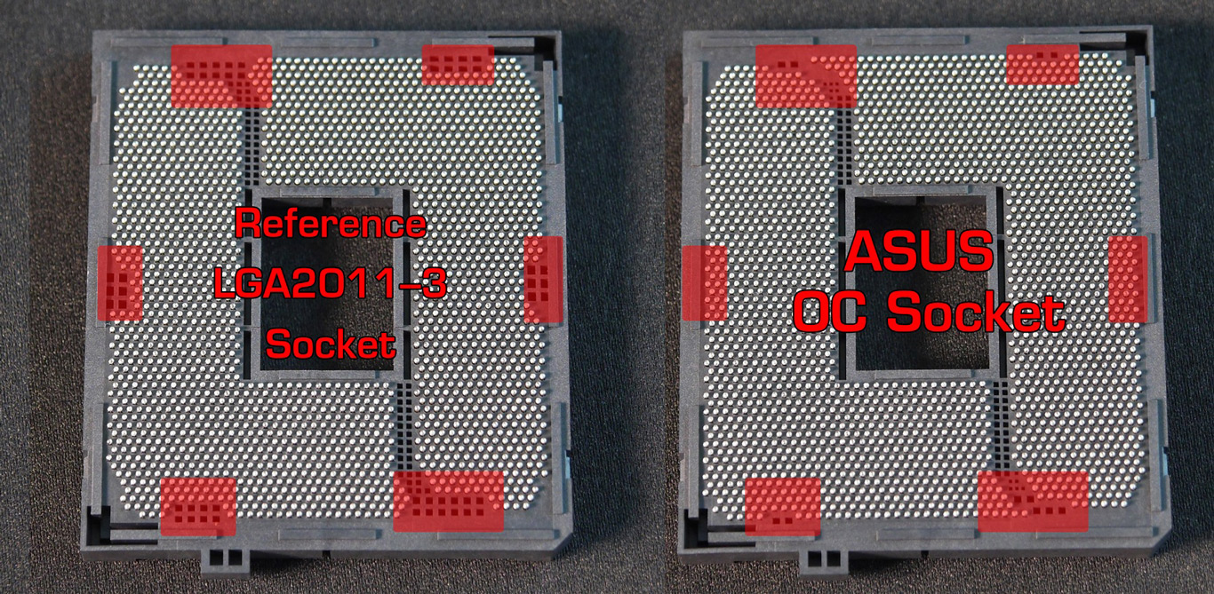 Одной из ключевых особенностей героини сегодняшнего обзора является применение оригинального процессорного разъема ASUS O.C. Socket. От стандартного LGA2011-3 его отличают дополнительные контакты, использование которых позволяет улучшить разгонный потенциал Haswell-E и модулей ОЗУ DDR4.