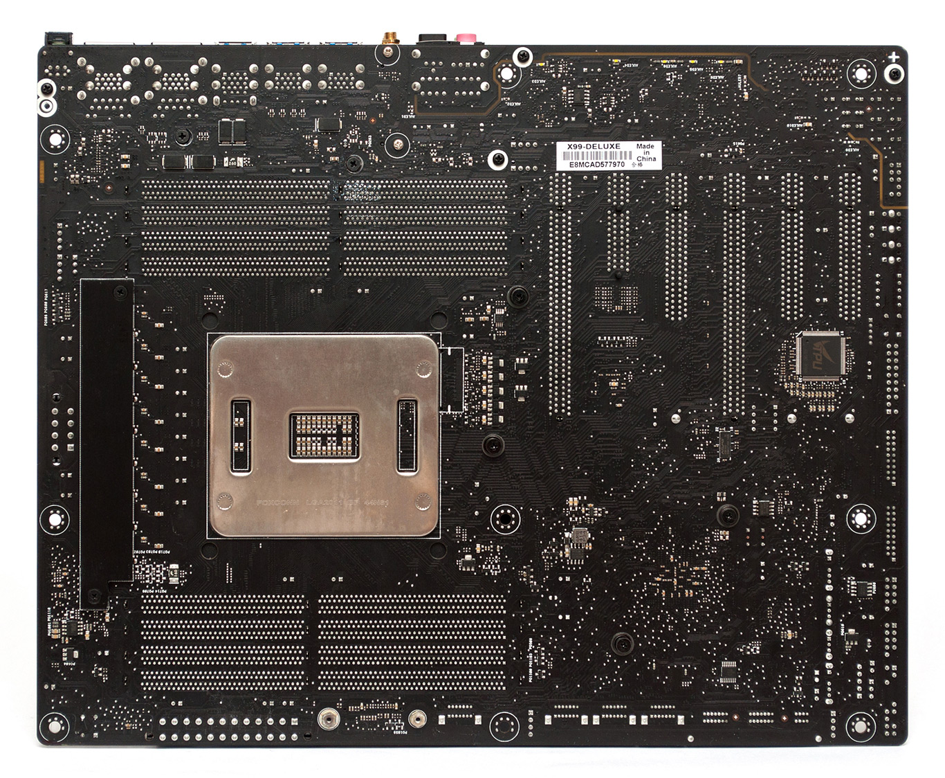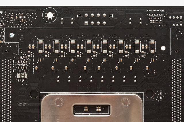 C обратной стороны печатной платы находится некоторое количество электронных компонентов, а в районе процессорного разъема видна металлическая пластина, которая является частью системы охлаждения VRM.