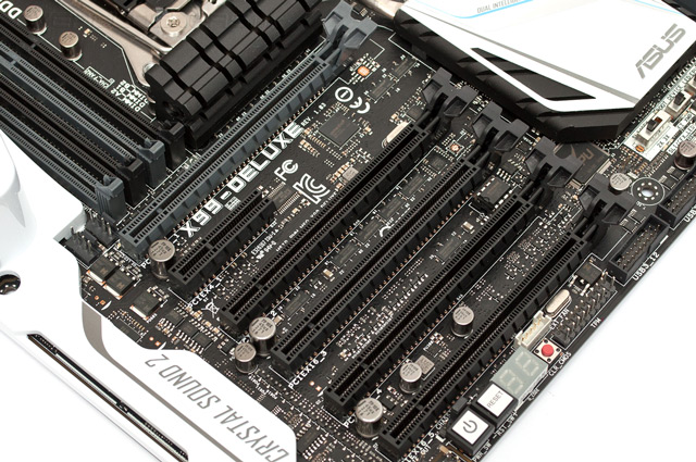 ASUS X99-Deluxe оснащена пятью разъемами PCI Express 3.0 x16, есть возможность построения связок AMD CrossFireX и NVIDIA SLI, но одновременно можно установить только три графических ускорителя. Владельцам процессоров Core i7-5960X и Core i7-5930K доступны режимы «x16+x0+x0+x0+x0», «x16+x0+x16+x0+x0» и «x16+x0+x16+x0+x8». В случае инсталляции младшего Core i7-5820K, у которого количество линий PCI-E уменьшено до 28, разъемы PCI Express будут работать по схемам «x16+x0+x0+x0+x0», x16+x8+x0+x0+x0» или x8+x8+x0+x8+x0», а третий и пятый по счет порты PCI-E x16 автоматически переключатся в режим x16@x1. Также имеется один слот PCI-E 2.0 x4, подключенный к системной логике, который предназначен для эксплуатации плат расширения, требовательных к пропускной способности интерфейса. Для того, чтобы обслужить разъем PCI-E 2.0 x4 и многочисленные дополнительные контроллеры конструкторы установили восьмипортовый коммутатор линий PCI-E 2.0 ASMedia ASM1187e.