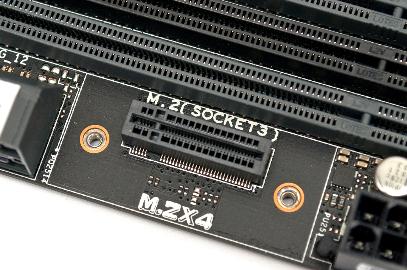 На правом крае системной платы перед разъемами DIMM DDR4 находится слот M.2, предназначенный для установки скоростных твердотельных накопителей. К разъему подведены четыре линии PCI Express от центрального процессора, поэтому, при его использовании пятый по счету слот PCI Express 3.0 x16 автоматически переходит в режим x16@x4. Для удобства монтажа SSD в комплекте с «материнкой» поставляется M.2 Racket — металлическое шасси, фиксирующее накопитель и защищающее его от повреждений.