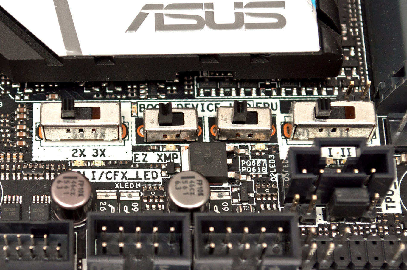 Новинка оснащена целым рядом механических переключателей, распложенных на нижнем крае печатной платы. SLI/CF Switch отвечает за выбор режимов работы слотов PCI Express x16 при построении связок из нескольких видеокарт, причем, в зависимости от конфигурации рекомендуемые для использования разъемы подсвечиваются светодиодами. EZ XMP активирует встроенные профили повышенного быстродействия модулей ОЗУ, EPU включает режим дополнительной экономии электроэнергии, а TPU запускает автоматический разгон.