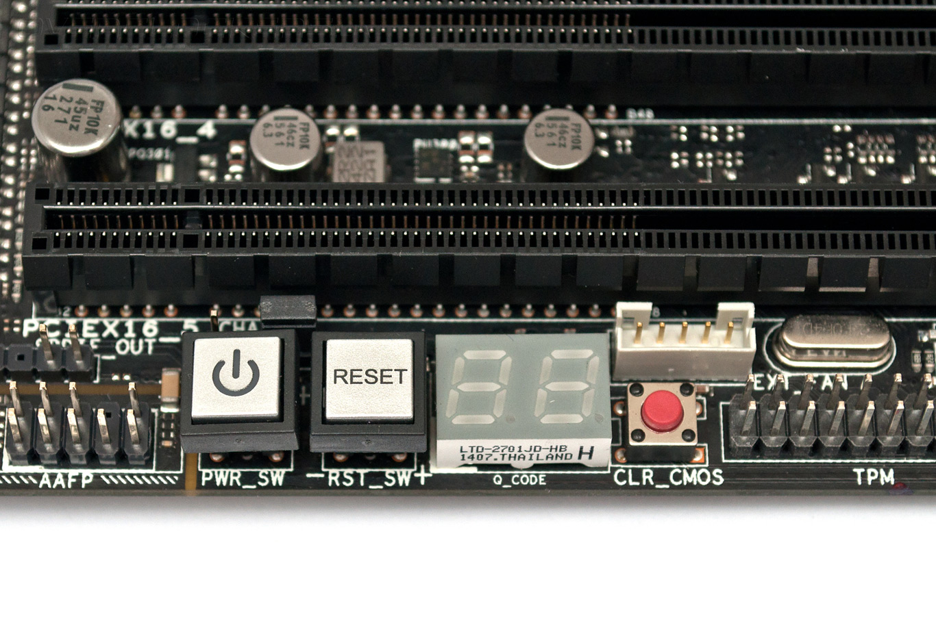 Пользователи, которые планируют эксплуатировать материнскую плату в составе открытого стенда оценят наличие механических кнопок включения и перегрузки, светодиодного индикатора кодов POST и клавиши Clear_CMOS, хотя, последняя ни разу не пригодилась за все время тестирования.