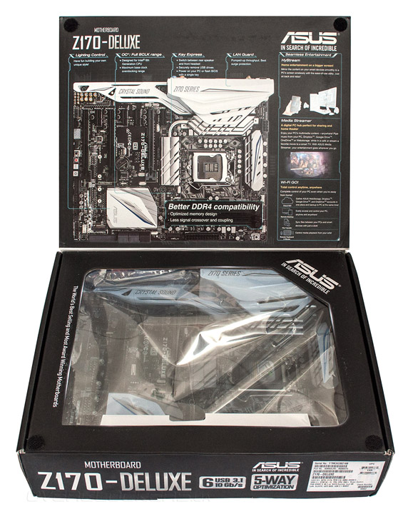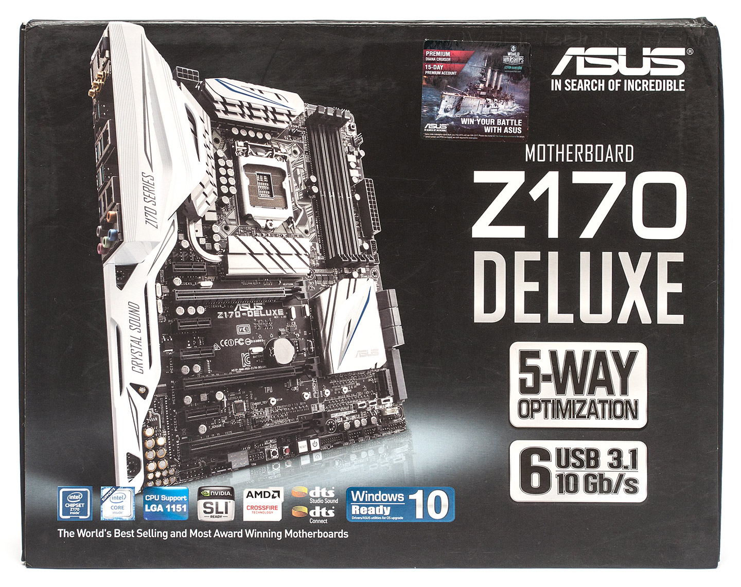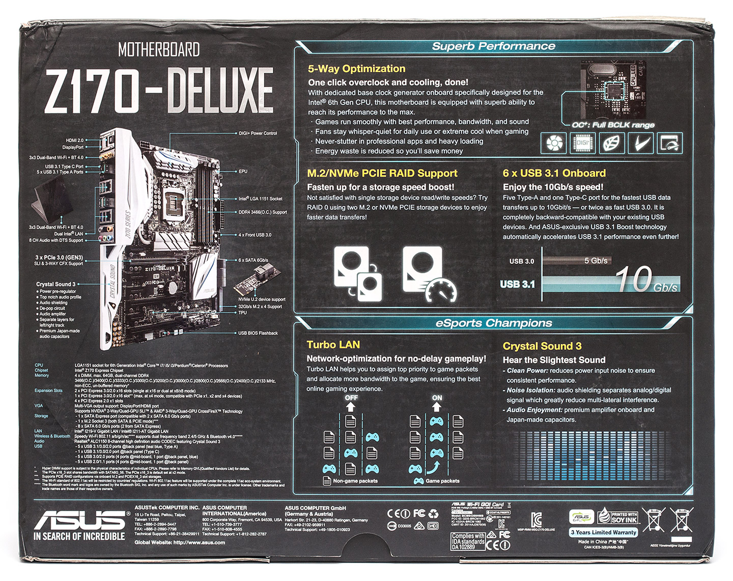 С обратной стороны коробки приведена спецификация ASUS Z170-Deluxe и перечислены ее основные возможности расширения, а также даны пояснения по некоторым конструктивным особенностям системной платы. Например, технология 5-Way Optimization означает комплекс аппаратно-программных средств, предназначенных для оптимизации работы силовой подсистемы и режима работы вентиляторов, гибкой настройки быстродействия и энергопотребления для получения максимальных результатов в любых условиях. Кроме того, «материнка» поддерживает создание массива RAID 0 из твердотельных накопителей M.2 и NVMe с интерфейсом PCI-E, а также оснащена шестью портами USB 3.1 с пропускной способностью 10 Гбит/с каждый.