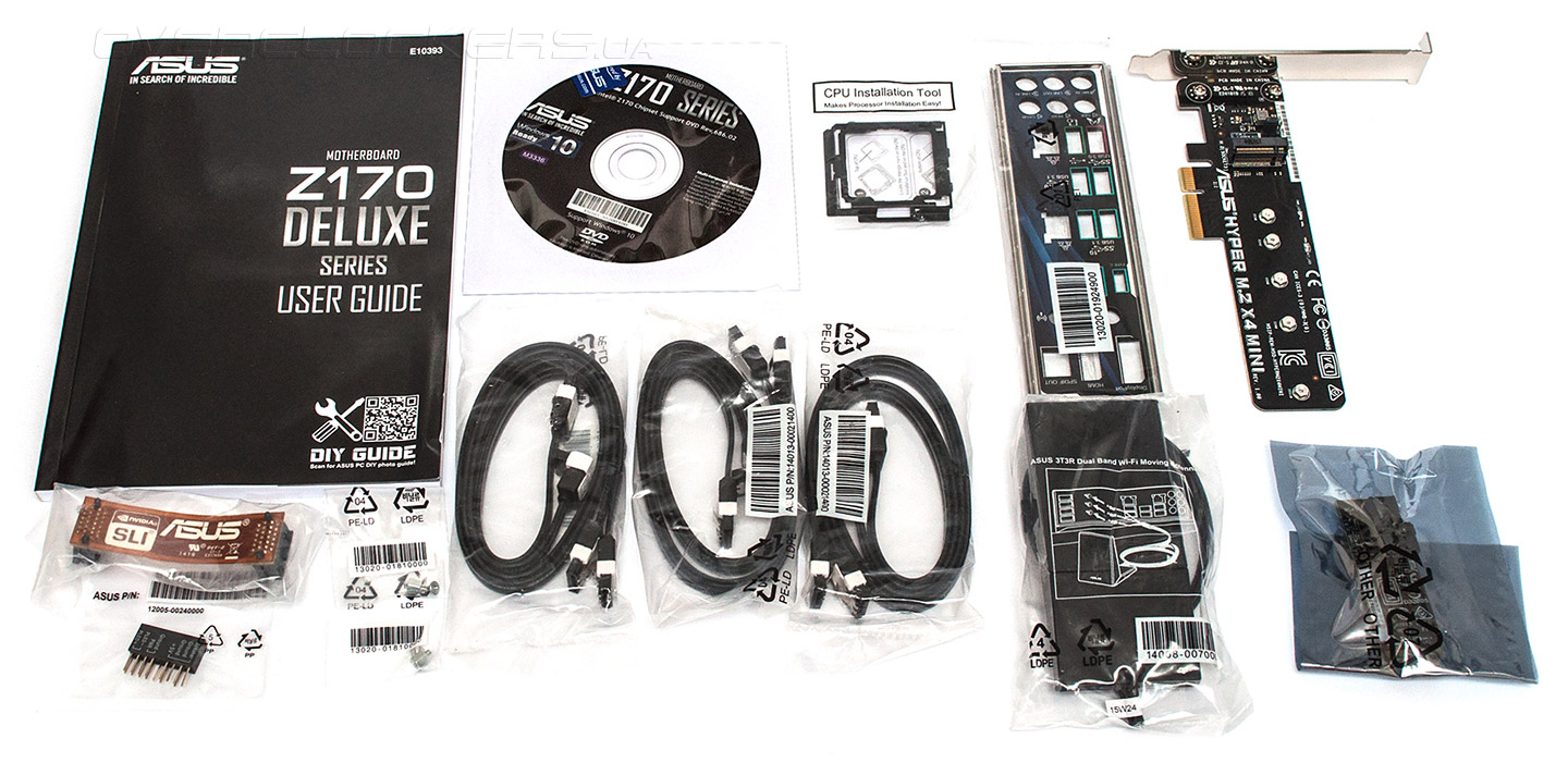 Комплект поставки ASUS Z170-Deluxe, как и полагается флагманскому продукту, чрезвычайно разнообразный, он состоит из: