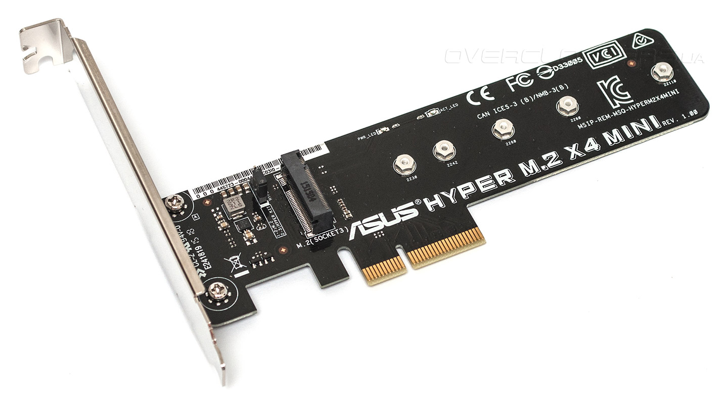 Следующий аксессуар — плата расширения HYPERM.2 X4 MINI для установки в слот PCI Express x4, которая оснащена разъемом M.2 Socket 3 и служит для установки твердотельного накопителя формата NGFF 2230/2242/2260/2280/22110, либо комплектного переходника Hyper Kit.