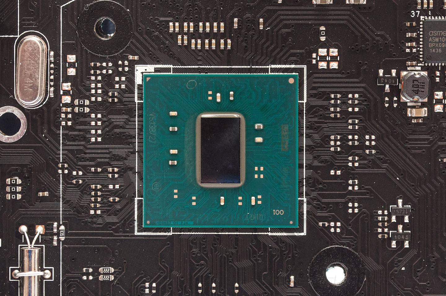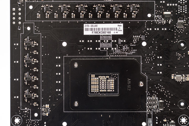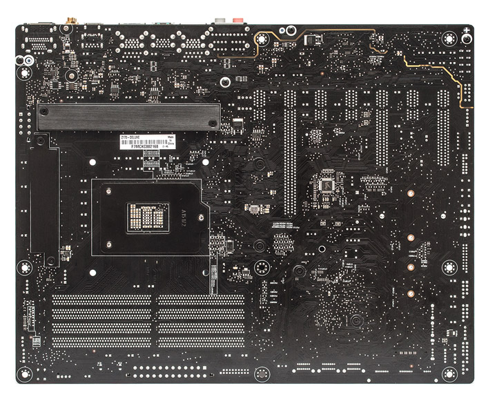 С обратной стороны печатной платы видно множество электронных компонентов, в том числе элементы подсистемы питания в районе процессорного разъема, накрытые металлическими пластинами, а также чип TPU, который отвечает за функции разгона.