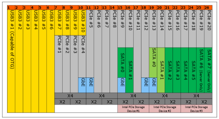 Для связи с процессором системная логика использует шину DMI 3.0 с пропускной способностью ~4 ГБ/с и предлагает богатый набор возможностей расширения: наличие 14 портов USB, из которых 10 могут работать в режиме USB 3.0, поддержку до 20 линий PCI Express 3.0 и шести каналов SATA 6 Гбит/с. Это стало возможным благодаря технологии Flexible IO, которая позволяет распределить 26 высокоскоростных чипсетных портов ввода-вывода между различными типами интерфейса, что дает производителям материнских плат свободу в реализации возможностей расширения.
