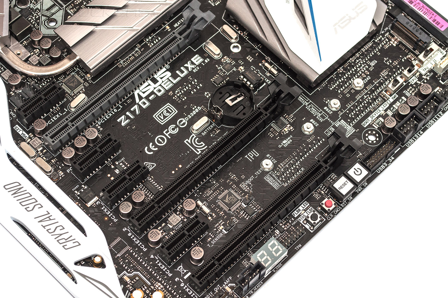Системная плата оснащена четырьмя разъемами DIMM для установки модулей ОЗУ DDR4 суммарными объемом до 64 ГБ. В режиме экстремального разгона частота оперативной памяти может достигать 3733 МГц. Что касается портов расширения, то ASUS Z170-Deluxe располагает парой слотов PCI Express 3.0 x16, подключенных к процессорному контроллеру PCI-E, которые могут функционировать по схемам «x16+x0», «x8+x8», тем самым обеспечивая работу связок AMD CrossFireX и NVIDIA SLI. Третий по счету разъем PCI Express 3.0 x16 подключен четырмя линиями PCI-E 3.0 к системной логике и может работать максимум в режиме x16@x4. Кроме того, для установки плат расширения «материнка» имеет четыре порта PCI Express 2.0 x1, которые подсоединены к семипортовому коммутатору ASMedia ASM1187. Остальные три канала последнего используются для подключения дополнительных контроллеров.