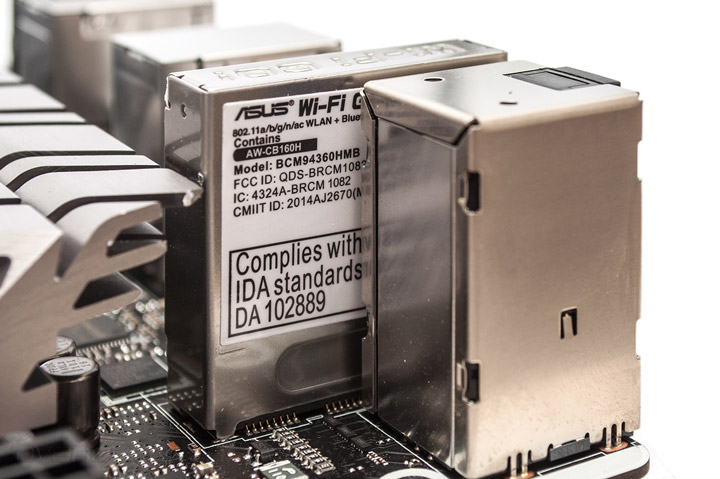 Что касается подключения периферийных устройств, то чипсет обеспечивает функционирование пяти интерфейсов USB 3.0 и такого же количества каналов USB 2.0, причем, только по одному порту каждого типа выведено на заднюю панель, а оставшиеся выполнены в виде внутренних разъемов. Кроме того системная плата оснащена тремя контроллерами ASMedia ASM1142, каждый из которых отвечает за работу двух каналов USB 3.1. Примечательно, что к системной логике контроллеры подключаются с помощью двух линий PCI-E 3.0, в ином случае не удалось бы обеспечить пропускную способность 10 Гбит/с. Для подключения к локальной сети Gigabit Ethernet используются пара чипов Intel: I219V и I211-AT, причем, первый является контроллером физического уровня и работает совместно с чипсетным MAC, а второй является полноценным NIC, который подсоединен к системной логике с помощью одной линии PCI-E. Кроме того, ASUS Z170-Deluxe оснащается адаптером беспроводных сетей AzureWave AW-CB160H, в основе которого лежит чипсет Broadcom BCM 4360, обеспечивающий работу в сетях Bluetooth 4.0 и Wi-Fi 802.11b/g/n/ac в диапазонах 2,4 и 5 ГГц, причем, в режиме 802.11ac 3T3R скорость может достигать 1300 Мбит/с.
