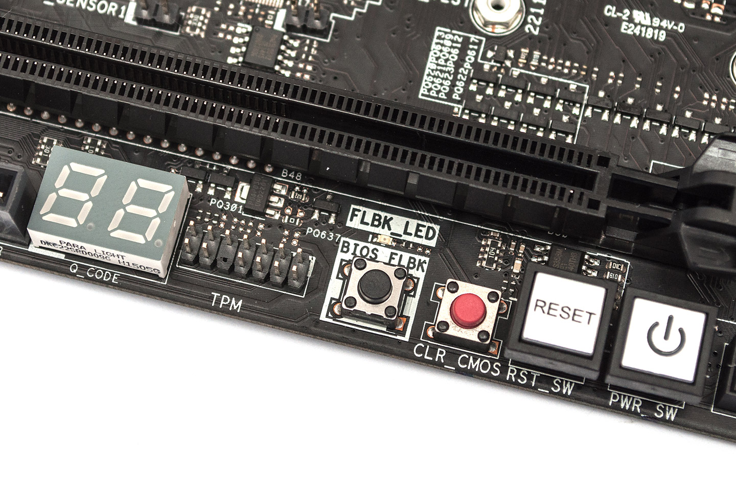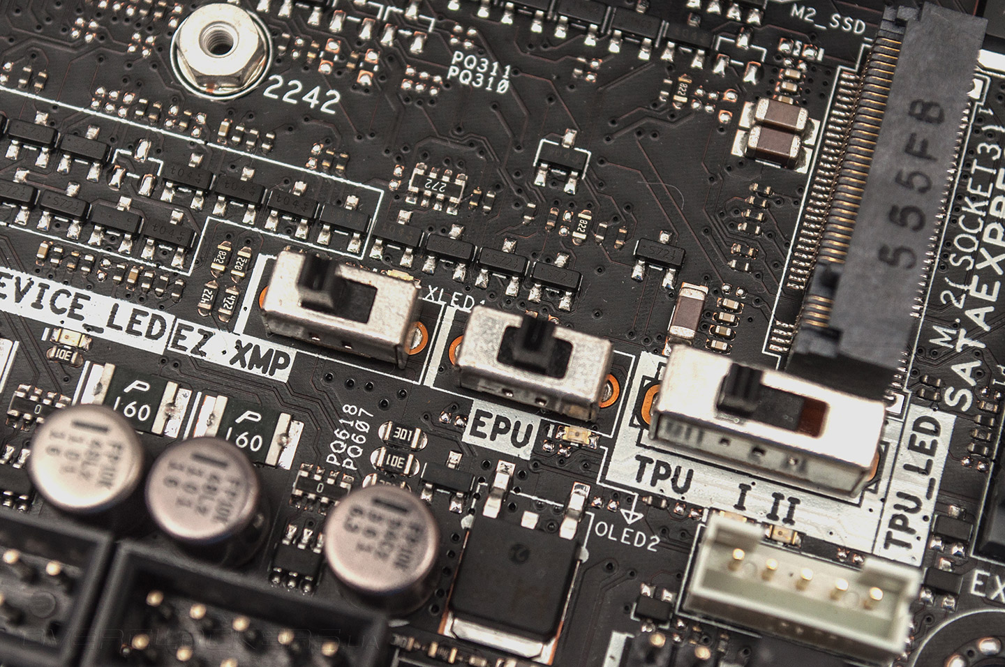 Кроме того, системная плата оснащена тремя механическими микропереключателями: EZ XMP активирует профили X.M.P. для модулей ОЗУ, EPU включает режим пониженного энергопотребления, а трехпозиционный TPU позволяет выбрать один из двух профилей автоматического разгона.