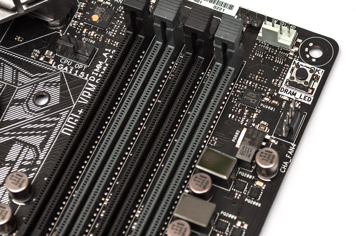 В правом верхнем углу находится кнопка MemOK, которая запускает одноименную функцию, помогающую загрузить систему в случае установки неработоспособных параметров ОЗУ. Рядом с ней расположен двухканальный преобразователь напряжения, который отвечает за электропитание модулей оперативной памяти.