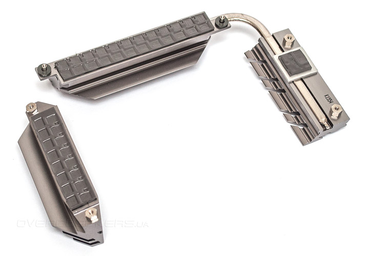 Каждый из охладителей через термоинтерфейс контактирует только с половиной силовых элементов, а термосифонная трубка, установленная на одном из них, передает избыточное тепло дополнительному радиатору, на подошве которого виднеется прокладка, контактирующая с коммутатором PCI Express ASM1187.