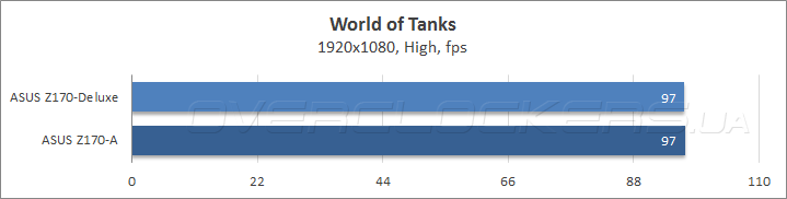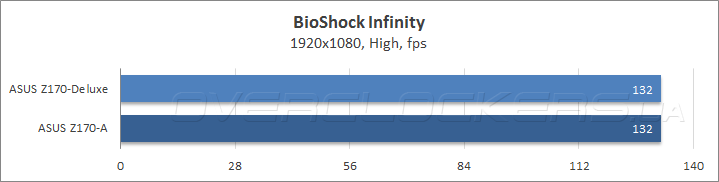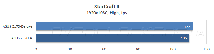 Чтобы уменьшить влияние графической подсистемы на частоту смены кадров в современных видеоиграх использовалось разрешение 1920х1080 и высокие, но не максимальные настройки качества изображения. В итоге, тестовый стенд на базе материнской платы ASUS Z170-Deluxe одержал победу в дисциплине StarCraft II, тогда как в автомобильном симуляторе GRID Autosport уступила несколько fps сопернице, а в двух оставшихся играх обе участницы показали одинаковый результат.
