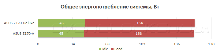 В обоих режимах системные платы показали идентичный уровень потребления электроэнергии, а проигрышь ASUS Z170-Deluxe в 1 Вт можно отнести к погрешности измерения. Впрочем, такие результаты ничуть не удивляют, учитывая схожесть управляющих микрокодов «материнок» и близкое родство конструкций их силовых подсистем.