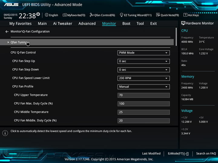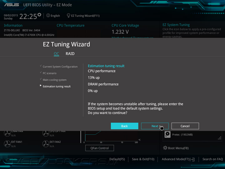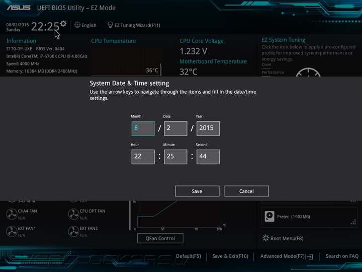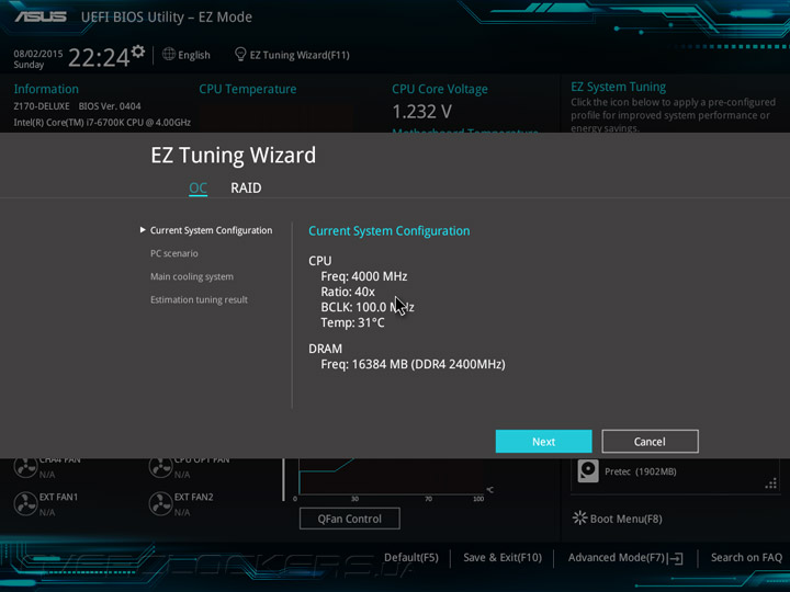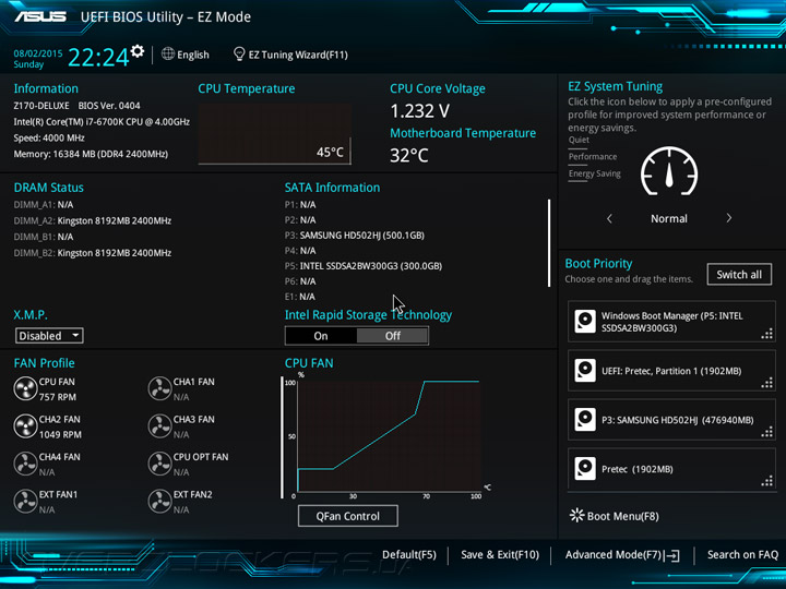 Прошивка ASUS Z170-Deluxe базируется на управляющем микрокоде UEFI разработки AMI. У новинки, как и у большинства современных системных плат производства ASUSTeK, стандартная утилита настройки Aptio заменена удобным графическим интерфейсом, который может работать в двух режимах: упрощенном EZ Mode и продвинутом Advanced Mode. В упрощенном режиме пользователи могут почерпнуть информацию об установленном процессоре и модулях ОЗУ, конфигурации дисковой подсистемы, получить сведения о частоте вращения вентиляторов, а также узнать текущие значения напряжения и температуры на CPU. Режим EZ Mode дает возможность активировать профили X.M.P. для модулей ОЗУ, настроить порядок инициализации загрузочных устройств, задать дату и время. Опция Q-Fan Control позволяет настроить работу вентиляторов, а мастер EZ Tuning Wizard поможет подобрать оптимальные параметры быстродействия системы в зависимости от характера нагрузки и установленной системы охлаждения.