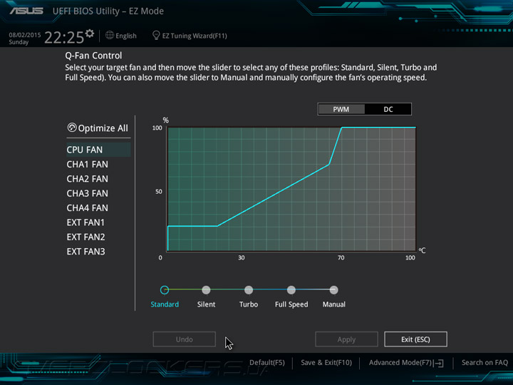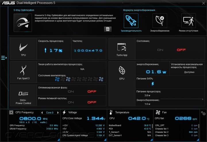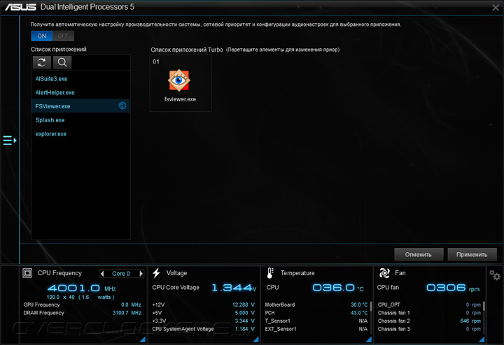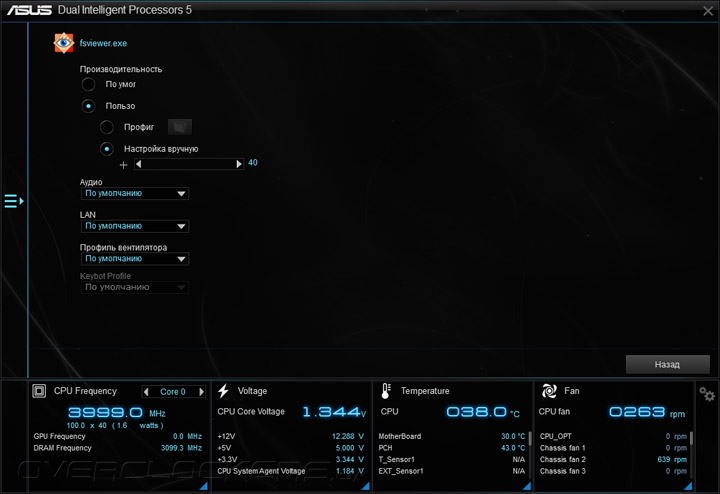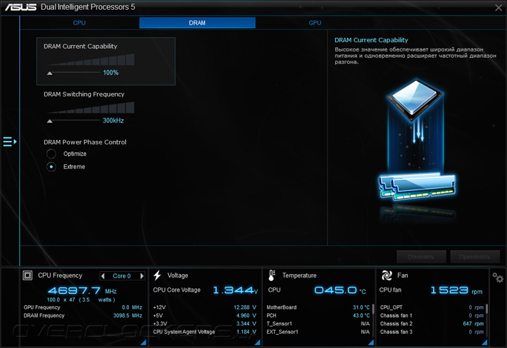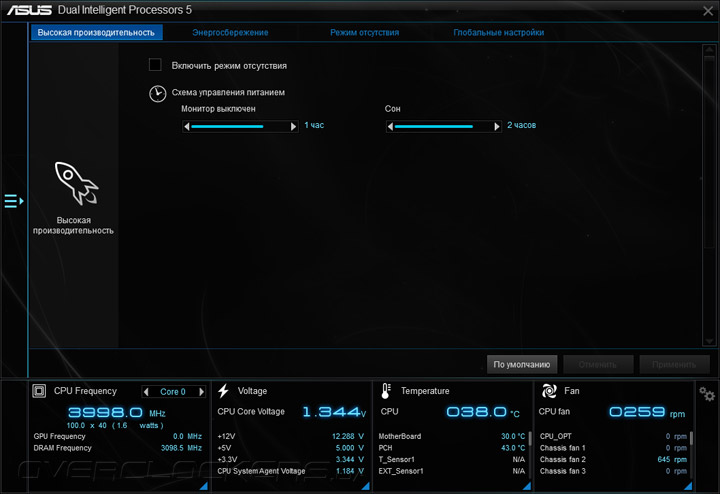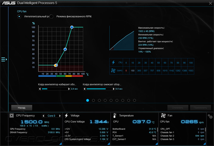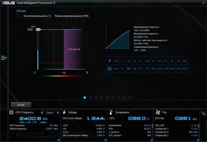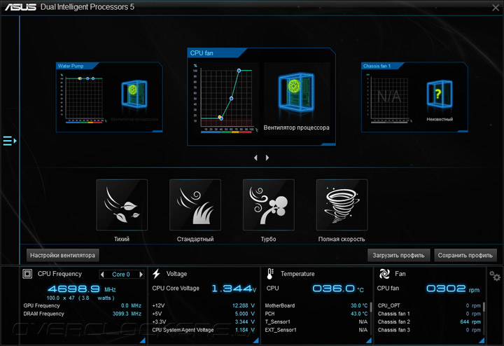 В своем составе программный модуль Dual Intelligent Processor 5 содержит функцию Fan Xpret 3, с помощью которой можно определить местоположение и откалибровать скорость вращения каждого вентилятора, после чего выбрать один из четырех предустановленных профилей либо задать режимы работы вручную, а также настроить автоматическое управление в зависимости от температуры.