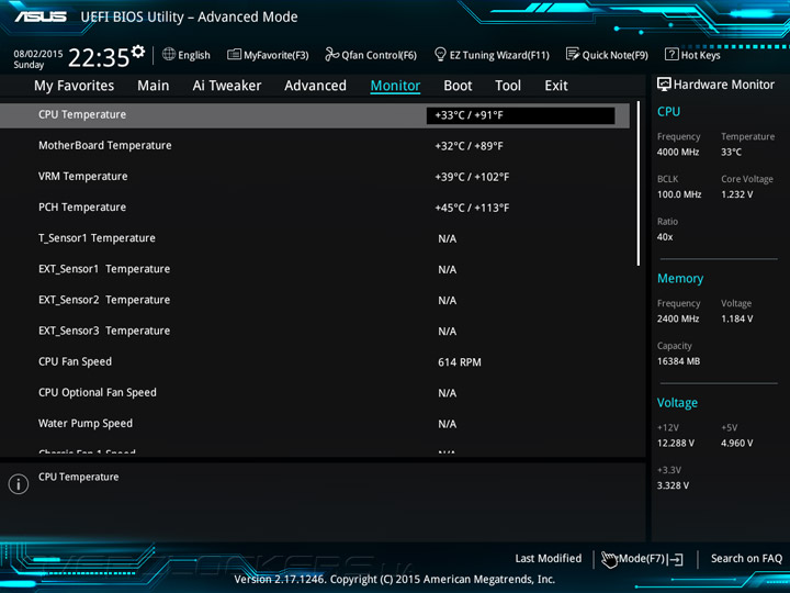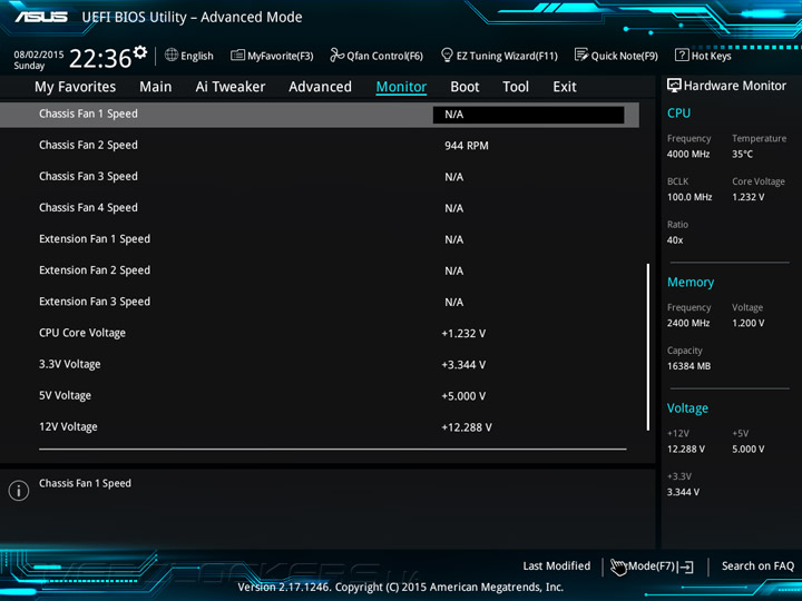 Вывод параметров системного мониторинга находится в одноименном разделе прошивки Monitor. Здесь отображаются показания четырёх встроенных температурных датчиков и одного внешнего сенсора, зарезервировано место для вывода значений от трех термопар, которые подключаются к внешней плате Fan Extension Card, а также приводятся показания девяти тахометрических датчиков и значения четырёх напряжений.