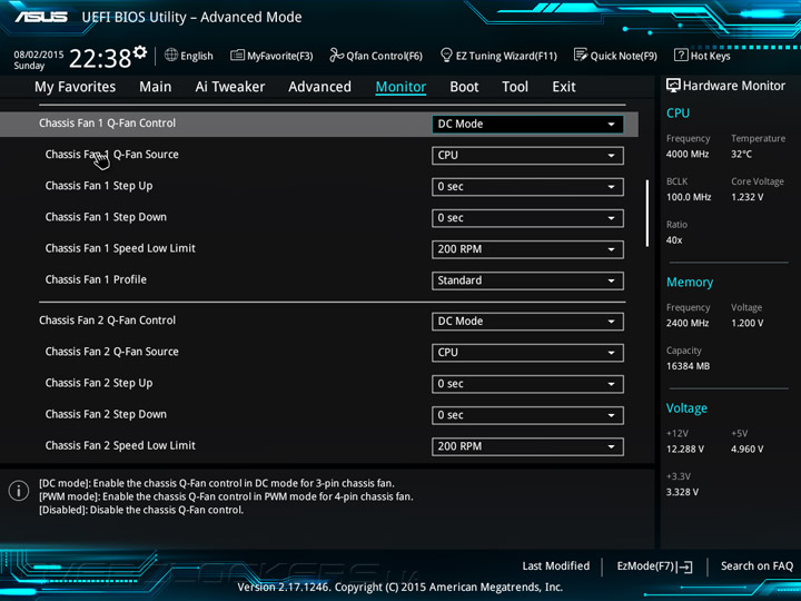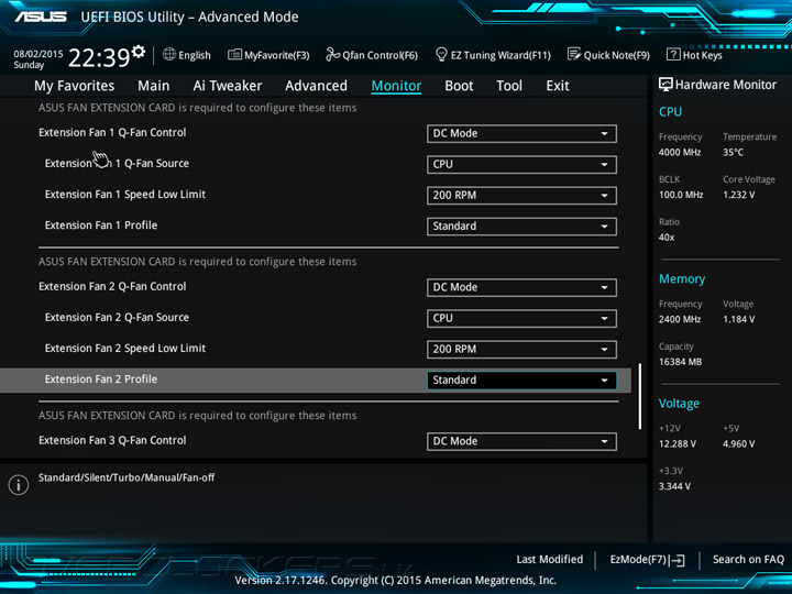 Настройки скоростей вращения вентиляторов сосредоточены в подменю Q-Fan Configuration, где задаются режимы работы всех девяти «карлсонов», в том числе трех дополнительных, подключаемых к плате Fan Extension Card. Для крыльчатки каждого охладителя можно выбрать один из трех предустановленных профилей, либо отрегулировать частоту вращения вручную, связав ее с показаниями одного из термодатчиков.