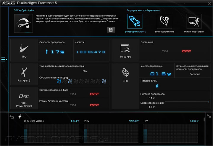 ASUS Z170-Deluxe комплектуются программным продуктом Ai Suite 3, хорошо знакомым нашим постоянным читателям по обзорам системных плат ASUSTeK предыдущего поколения. Это приложение, а также все необходимые драйверы и массу полезных утилит, можно найти на комплектном DVD, либо скачать на сайте производителя. Программа Ai Suite 3 имеет модульную структуру и состоит из отдельных приложений, объединенных общим пользовательским интерфейсом. В нижней части окна находится информационная панель, на которую выводятся текущие параметры быстродействия и показания сенсоров аппаратного мониторинга. Нажав на группу датчиков, пользователи получают возможность отследить динамику изменения параметров. Кроме того, есть возможность задать граничные значения, по достижении которых сработает оповещение. По умолчанию после запуска Ai Suite 3 открывается модуль Dual Intelligent Processor 5, отвечающий за разгон, управление энергопотреблением, настройку работы вентиляторов и многое другое.
