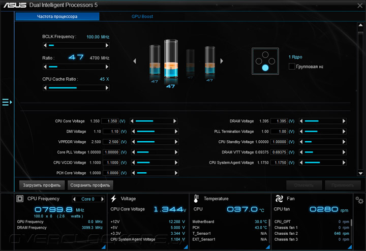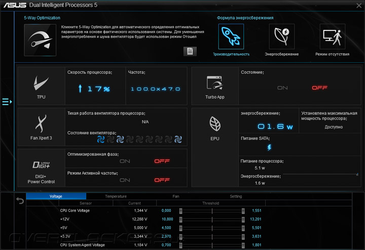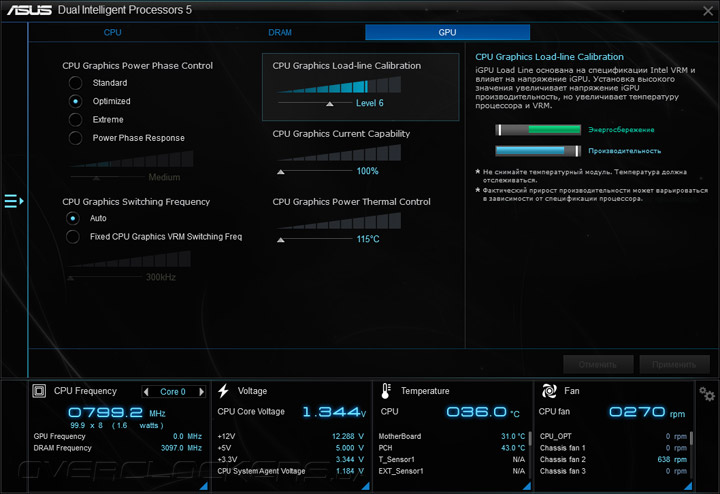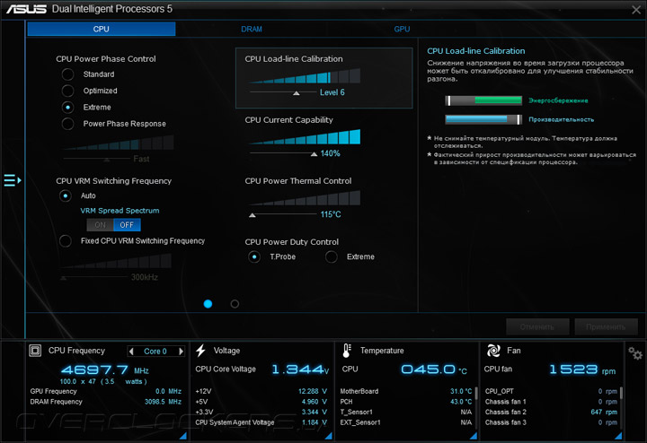 Для контроля силовой подсистемы служит функция Digi+ Power Control, которая предлагает настройки, аналогичные одноименному подменю в UEFI Setup как то: управление функцией Load-Line Calibration и частотой переключения силовых элементов, а также отключение неиспользуемых фаз VRM.