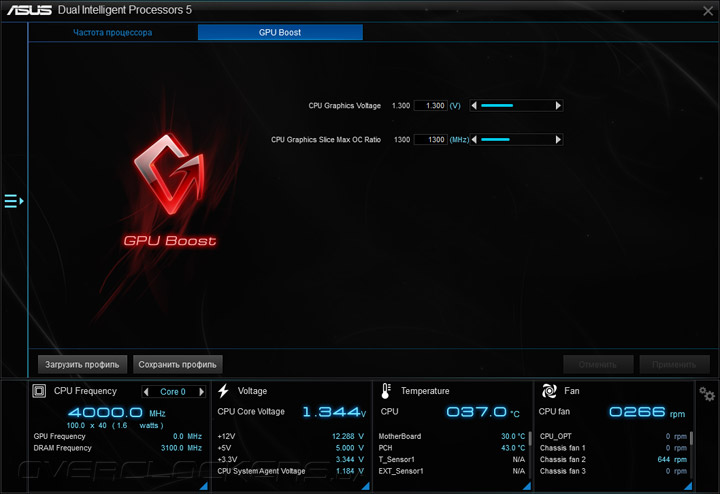 В помощь новичкам, не имеющим навыков по разгону, прошивка системной платы предлагает два профиля повышенного быстродействия. При выборе набора настроек TPU I частота процессора варьировала в пределах 4100–4300 МГц в зависимости от характера нагрузки, тогда как режим работы модулей ОЗУ не подвергался модификациям.