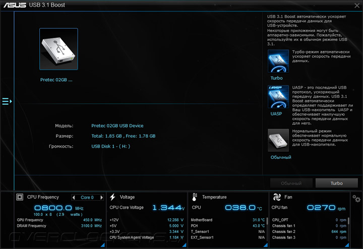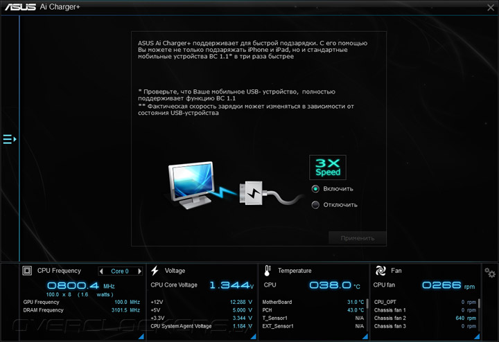 Кроме Dual Intelligent Processor 5 программный продукт Ai Suite 3 может предложить утилиту Ai Charger+ для быстрой зарядки портативных устройств от портов USB, а также подпрограмму USB 3.1 Boost, которая служит для ускорения передачи данных на внешние накопители путем активации протокола UASP (USB Attached CSCI Protocol).