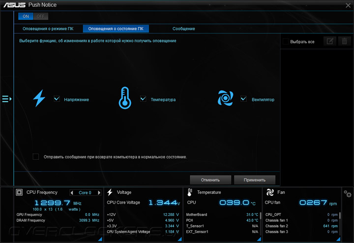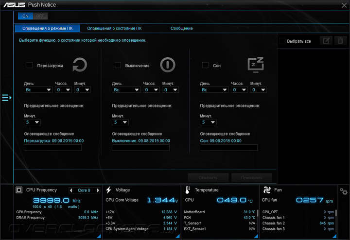 Среди полезных функций, предлагаемых программой Ai Suite 3, нельзя не отметить утилиту Push Notice, которая позволяет по расписанию перегружать, выключить и погружать ПК в сон, а также формировать и отправлять уведомления в случае достижения параметров системного мониторинга критических значений.