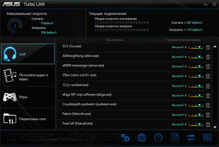 Помимо Ai Suite 3 вместе с материнской платой поставляется приложение TurboLan, предназначенное для управления полосой пропускания сетевого подключения. С помощью простого и понятного интерфейса пользователи могут выбрать один из четырёх профилей, соответствующих наиболее распространённым сценариям использования, с возможность ручной корректировки приоритетов для каждого приложения.
