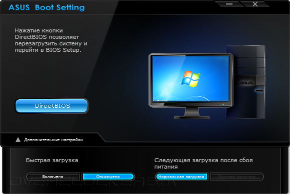 Наконец, любители разгона, которым приходится часто заходить в UEFI Setup для корректировки настроек, по достоинству оценят небольшую, но очень полезную утилиту Boot Settings, которая позволяет осуществить принудительный вход в прошивку при следующей перегрузке, а также отключить функцию FastBoot и задать параметры загрузки системы после сбоя электропитания.