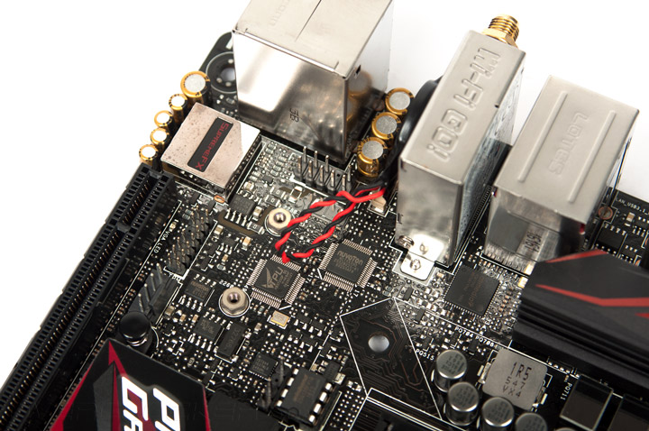 Вокруг отверстий для проведения монтажа системы охлаждения нет ничего, тогда как вся остальная часть и задней поверхности щедро изобилует всевозможной электроникой. Звуковая подсистема оснащена подсветкой в лице пяти светодиодов сочного красного свечения.