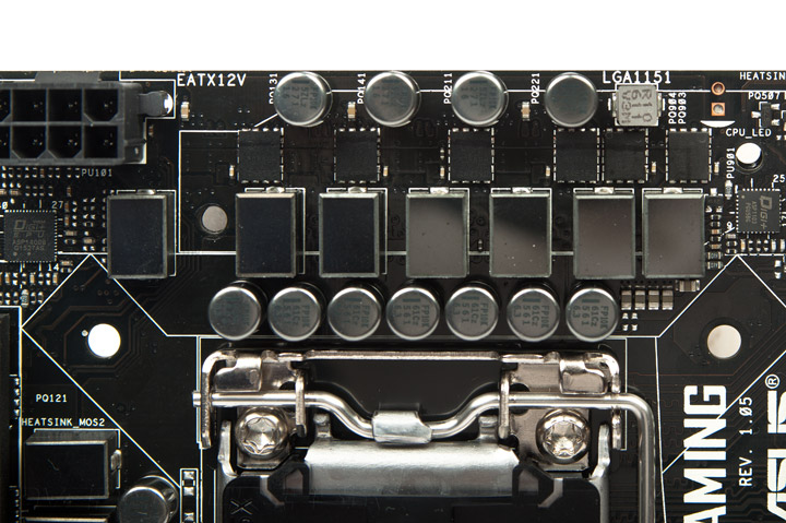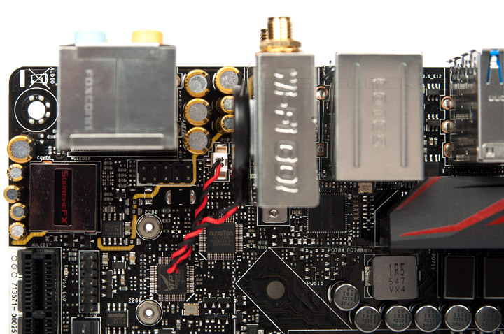 Ответственно подошли к реализации звуковой системы. Кодек находится под экраном, там есть ещё и несколько светодиодов, благодаря ним надпись SupremeFX может подсвечиваться. Позаботились про наличие специальных конденсаторов, присутствует и операционный усилитель. Немного ниже заметен индикатор VGA_LED из состава фирменного решения Q-LED. Светодиоды рассредоточены по всей плате, они позволят понять суть заминок при проблемном прохождении этапа инициализации оборудования.