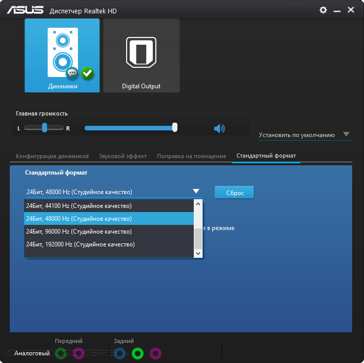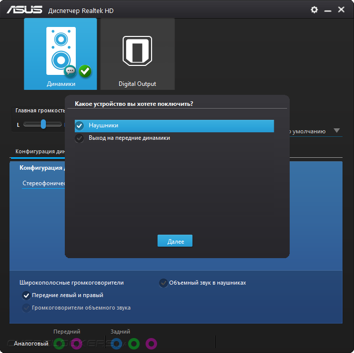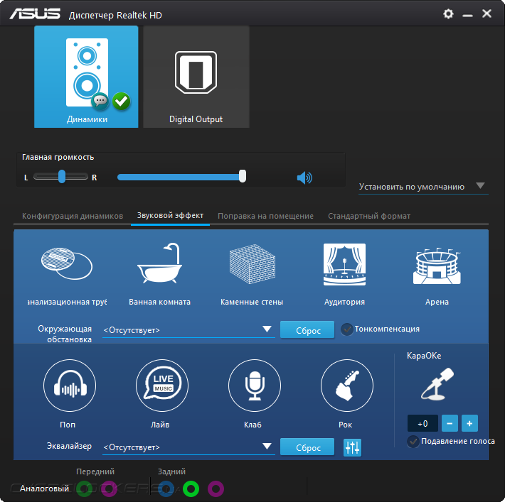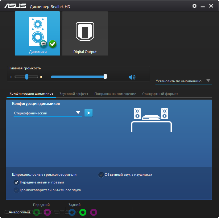 Настройка звуковой подсистемы проходит исключительно из-под конфигуратора от Realtek. Есть варианты по выбору типа звуковоспроизводящей аппаратуры, они позволяют в ощутимой доле изменить подачу материала, это — единственный мультимедийный козырь продукта.