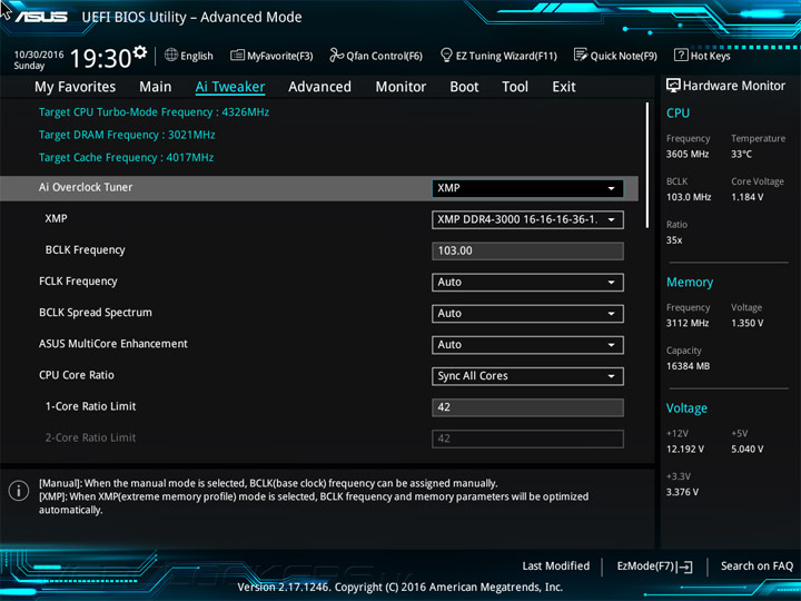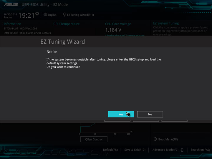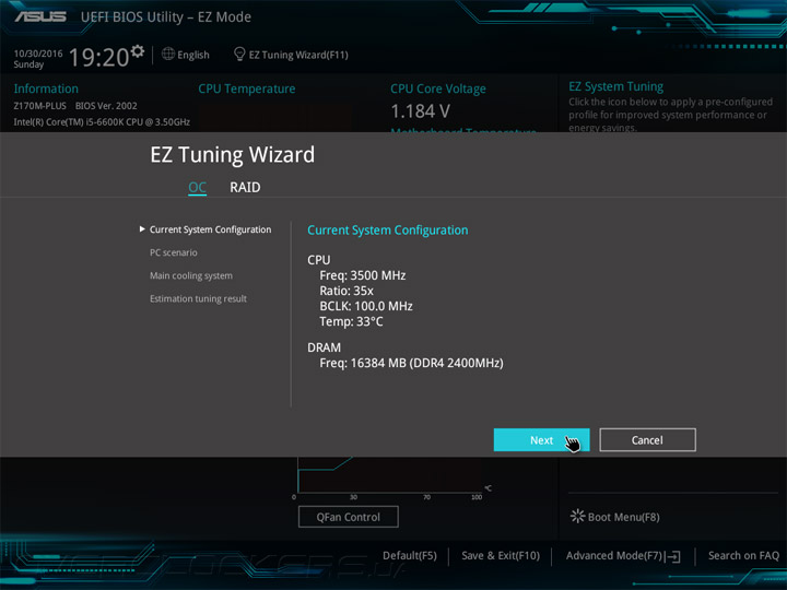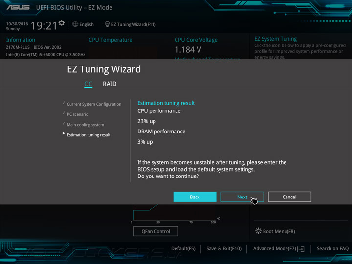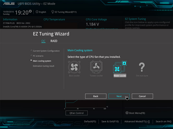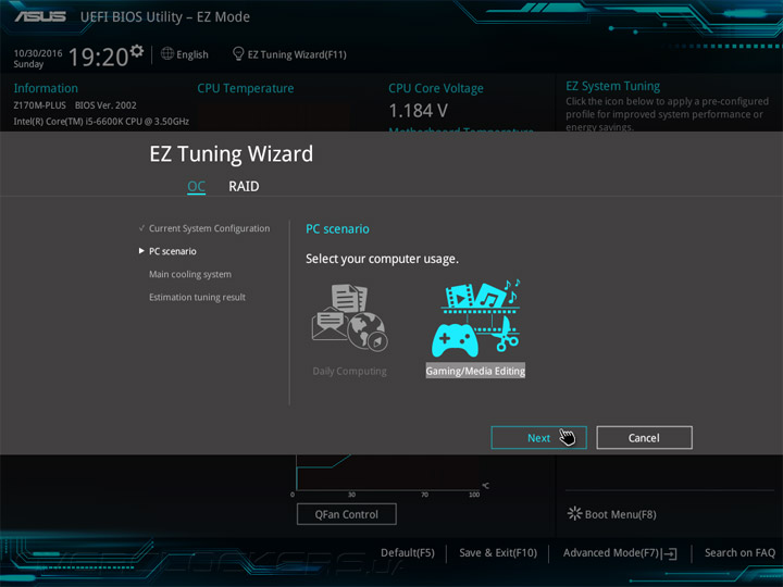Сперва изучим возможности изделия по ускоренному разгону. Один из механизмов — EZ Tuning Wizard. Выбирая в предложениях мастера Gaming/Media Editing и Water cooler, можно рассчитывать на частоту ЦП величиной 4326 МГц.