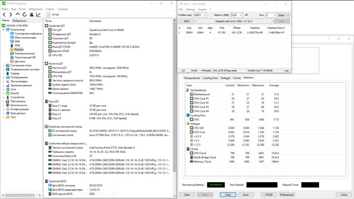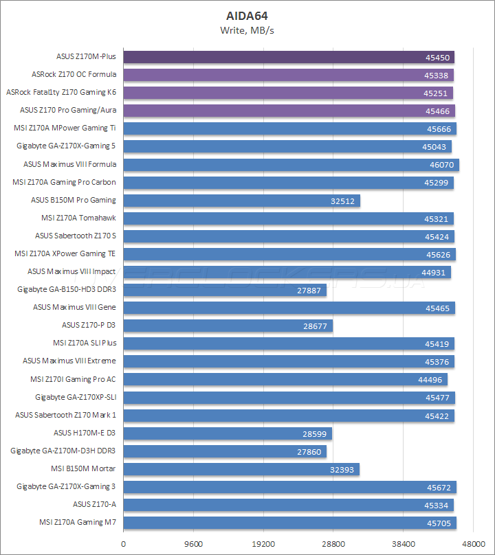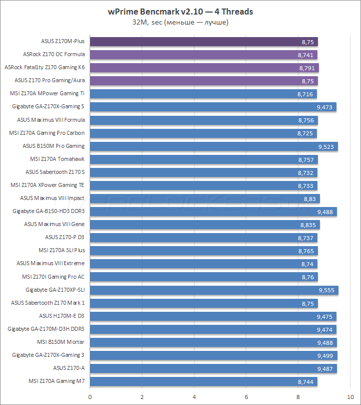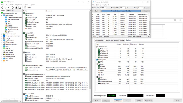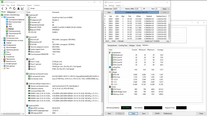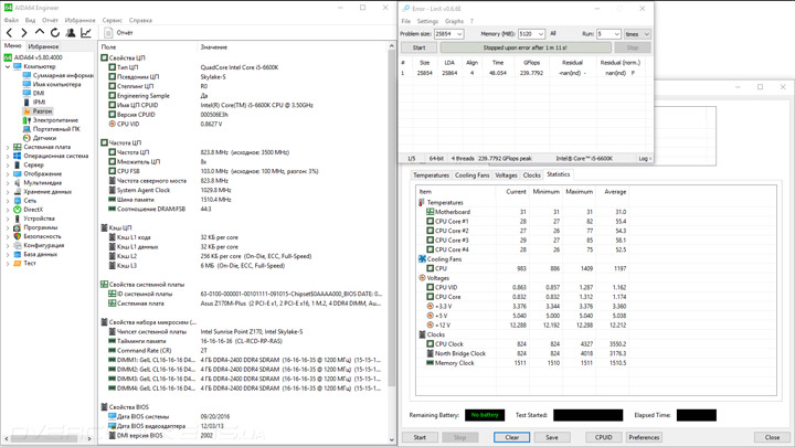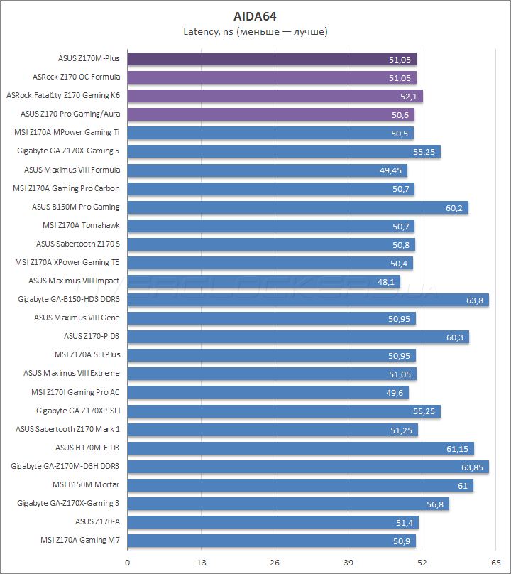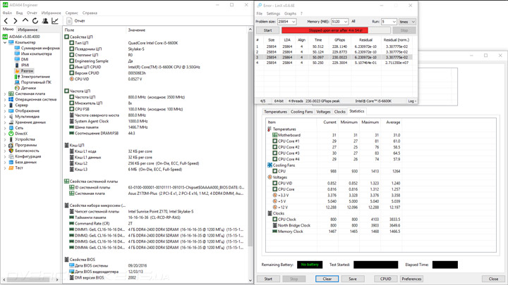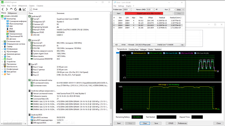 C недавних пор здесь платы ASUS стали активировать XMP, а повышенный на 3 МГц BCLK добавляет частоты модулям памяти ещё больше. К такому наша испытуемая была явно не готова. Простые задачи вроде архивации работали без ошибок, но LinX оказался слишком тяжёлым испытанием. Впрочем, куда более грозная ASUS Z170 Pro Gaming/Aura также здесь сплоховала.