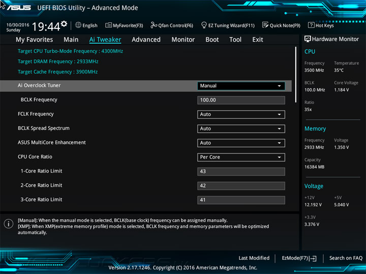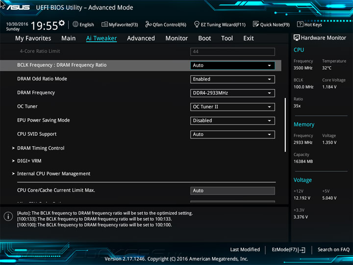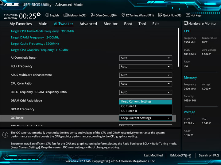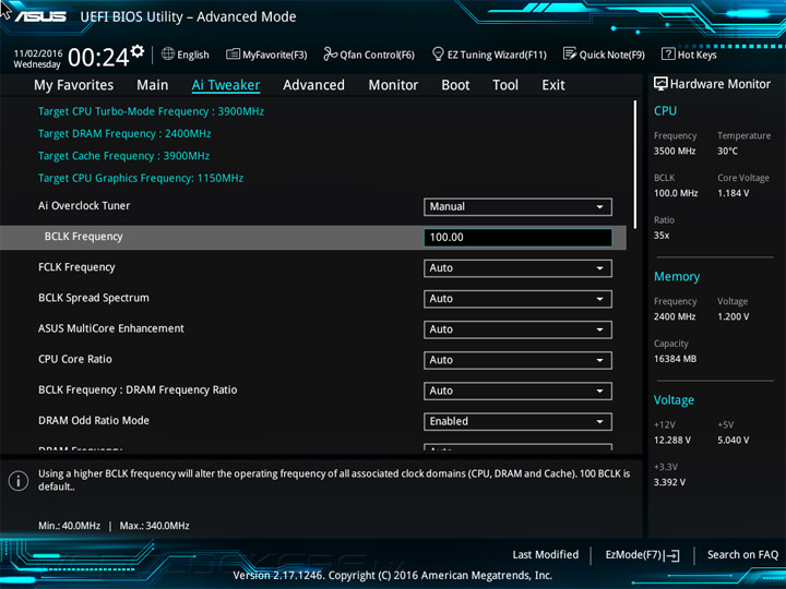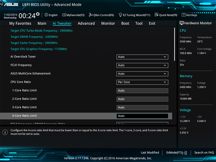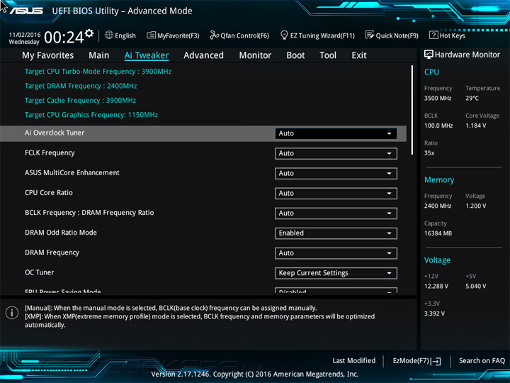 Разгонять систему поможет набор функций из Ai Tweaker. Настроек достаточно, наибольшее упрощение на фоне старших плат — меньшее число доступных к изменению напряжений, но все основные — на месте. К сожалению, считывается значение лишь CPU Voltage, тогда как остальным параметрам придётся слепо верить.