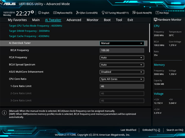 Разгон процессора не стал лёгкой прогулкой по пунктам в UEFI. Оказалось, CPU IO необходимо изрядно повысить, чтобы используемый комплект ОЗУ позволил тестам завершиться без ошибок, хотя память типа DDR3L (и её низкая частота относительно текущих 3 ГГц) на Z170-P D3 не требовала отхода от паспортных номиналов. В итоге, барьер в 4,6 ГГц был взят с напряжением 1,385 В вместе с профилем LLC «Level 5».
