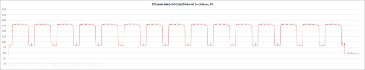Замеры выполнялись после прохождения всех прочих тестов в «устоявшемся» режиме компьютера при помощи прибора собственной разработки. Методика заключалась в фиксации средневзвешенного значения потребления тестового стенда «от розетки» во время прохождения теста Prime95 с применением профиля In-place large FFTs а также при простое компьютера после завершения теста.