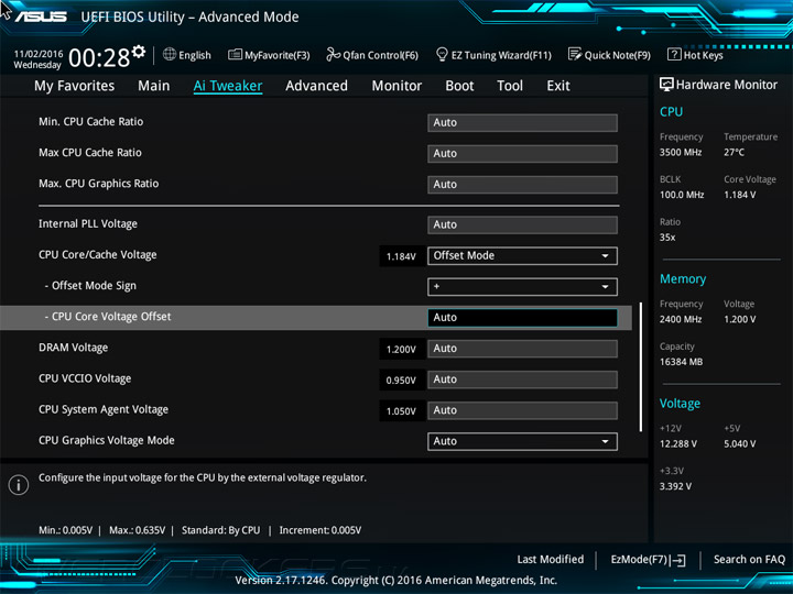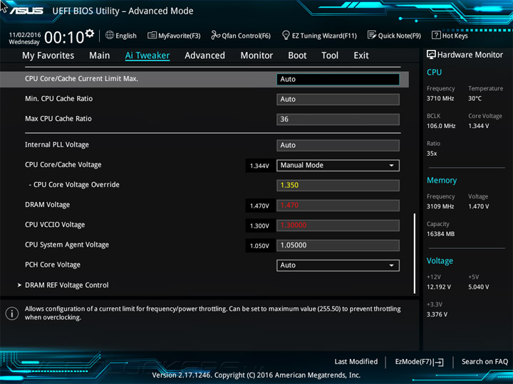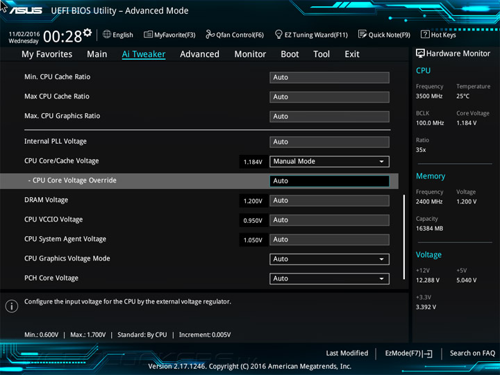 | CPU Core Voltage Override (В) | 0,6–1,7 | 0,005 |