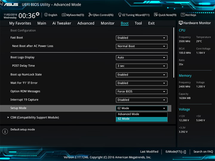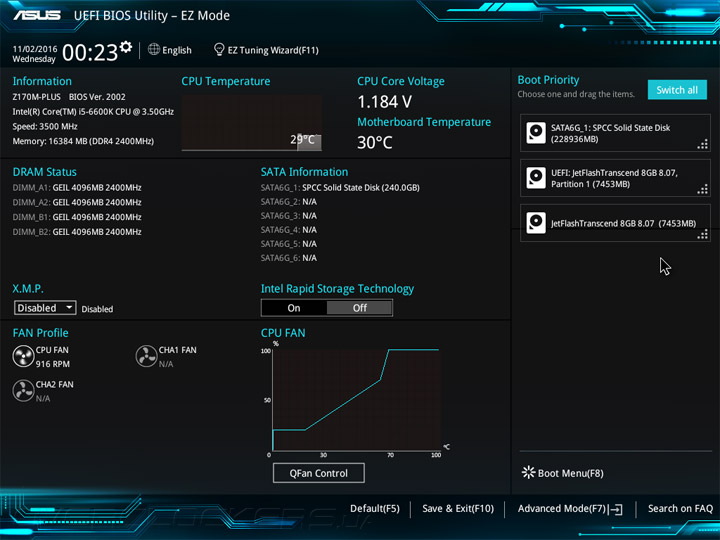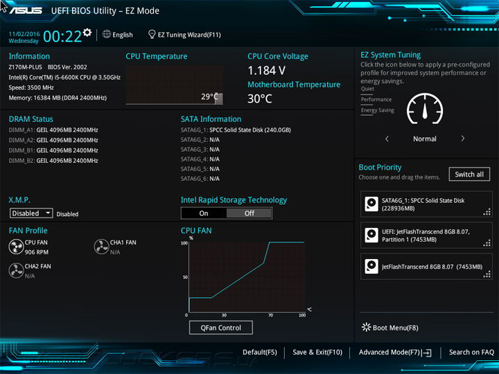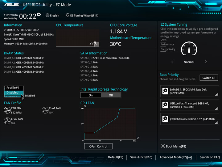 EZ Mode — простая оболочка с минимальным инструментарием для настройки системы. Можно установить время, активировать профиль для памяти (при его наличии у используемого комплекта), указать приоритет в списке загрузочных устройств, выбрать режим работы для охладителей.