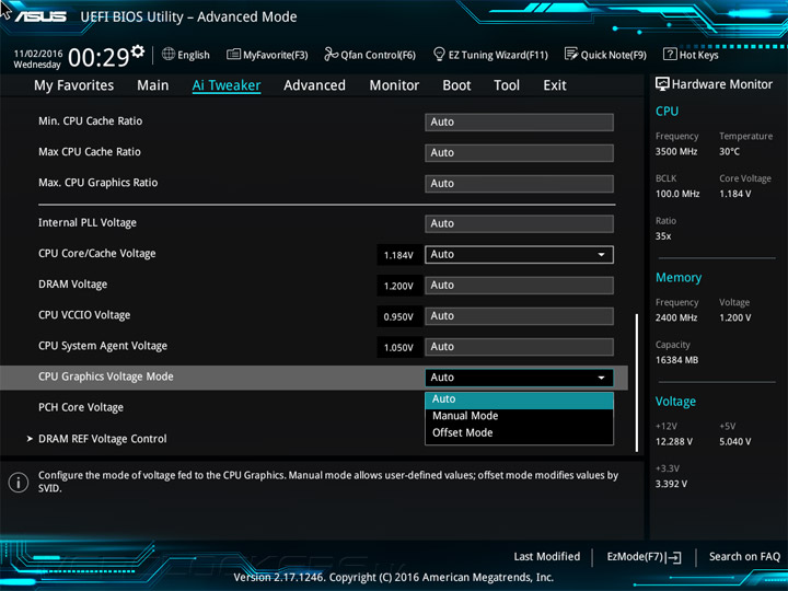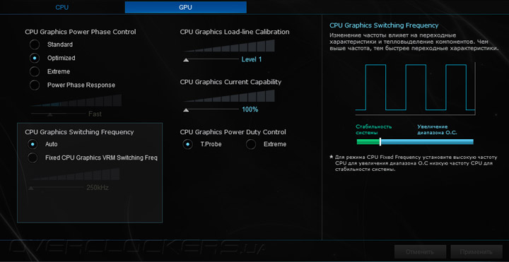 | CPU Graphics Voltage Override (В) | 0,6–1,7 | 0,005 |