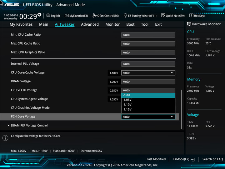 | PCH Core Voltage (В) | 1,0–1,15 | 0,05 |
