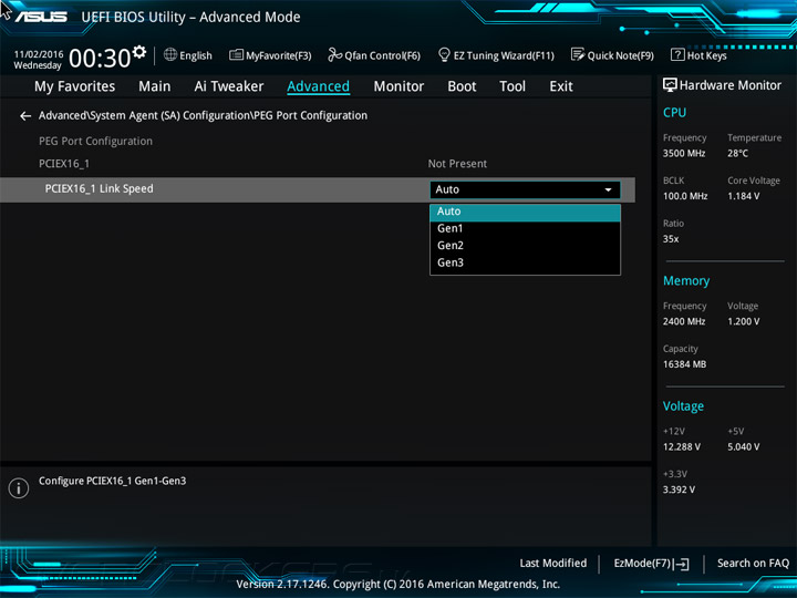 Все линии PCI-E от ЦП в числе 16 штук заведены на верхний слот PCI-E серого цвета, нижний работает от PCH, там больше четырёх линий сконцентрировать не получится.