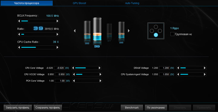 Следующий способ — готовые профили, именуемые как OC Tuner, хотя на старших платах используют другое название — TPU. Суть одинакова. Первый из профилей, с привлечением Turbo Boost, позволит работать процессору на 4,3 ГГц.